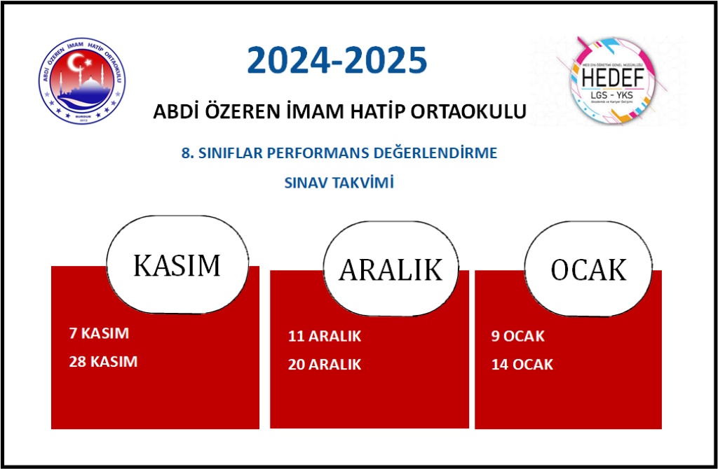 LGS'ye yönelik okulumuzda uygulanan Performans Değerlendirme Sınavı 11 Aralık 2024 tarihinde gerçekleştirilecektir. Tüm velilerimize ve çğretmenlerimize duyurulur. 1. Dönem performans değerlendirme sınavı takvimine aşağıdan ulaşabilirsiniz.